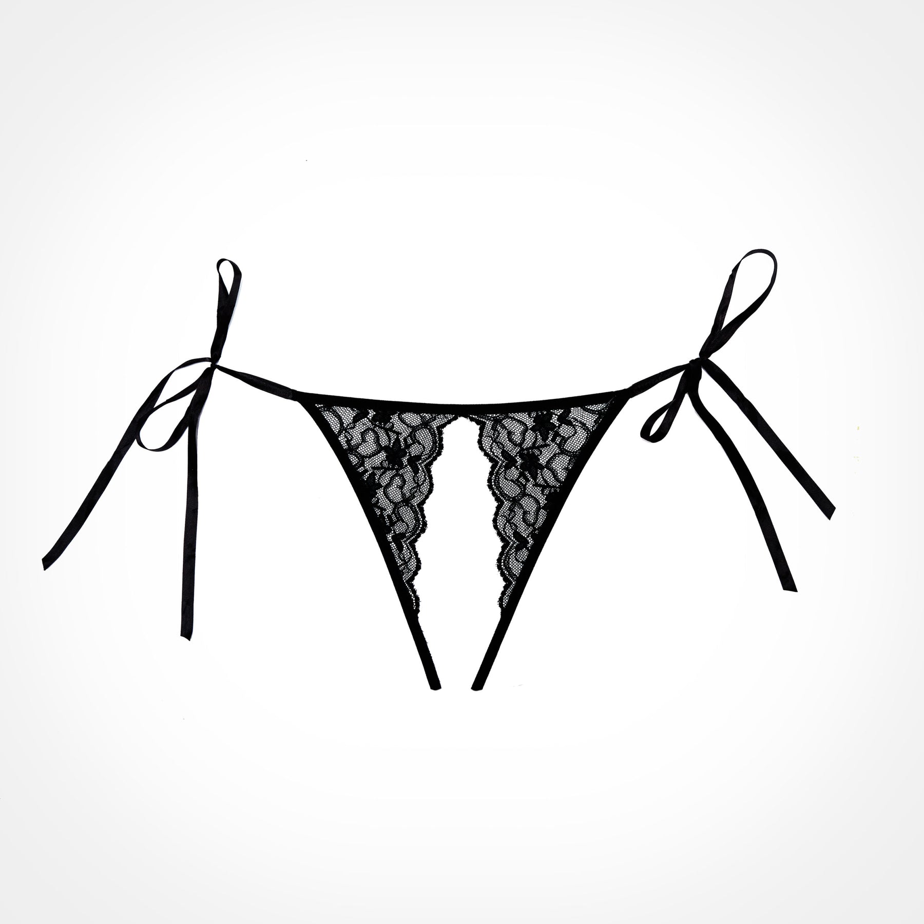 Teasing skinny ribbons decorate the hips, waiting to be undone. Scalloped lace outlines a provocative ouverte front, while the Brazilian back is topped with a triangle of sheer mesh.