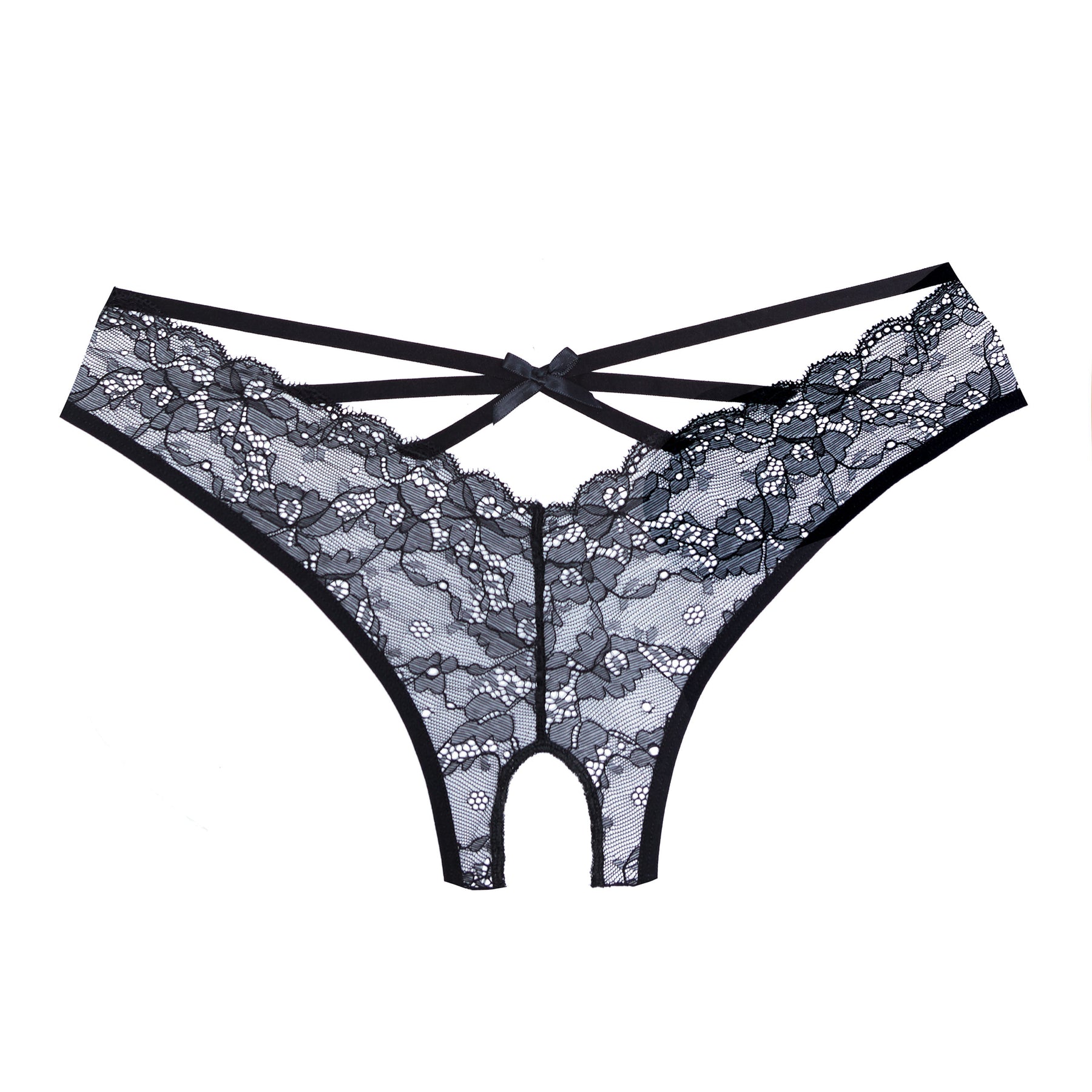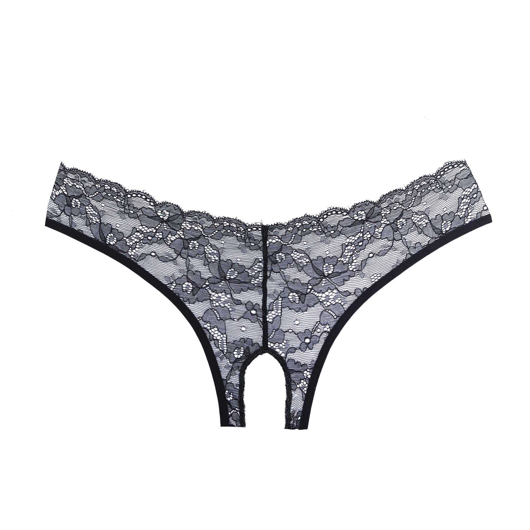 Flirt..seduce..play...the more lace the better. Ouverte panty with luxurious lace all around.  V back decorated with skinny straps. Crotchless.