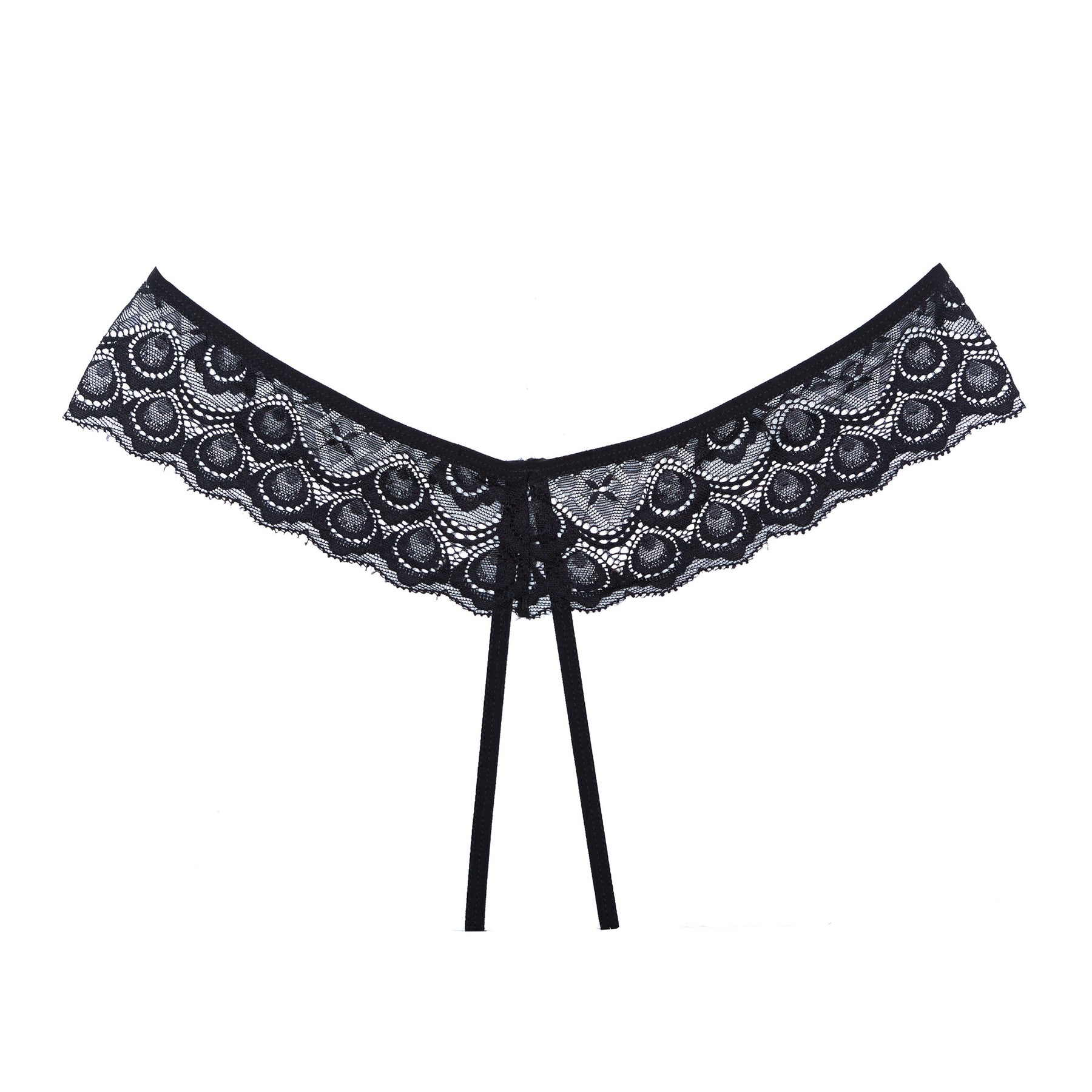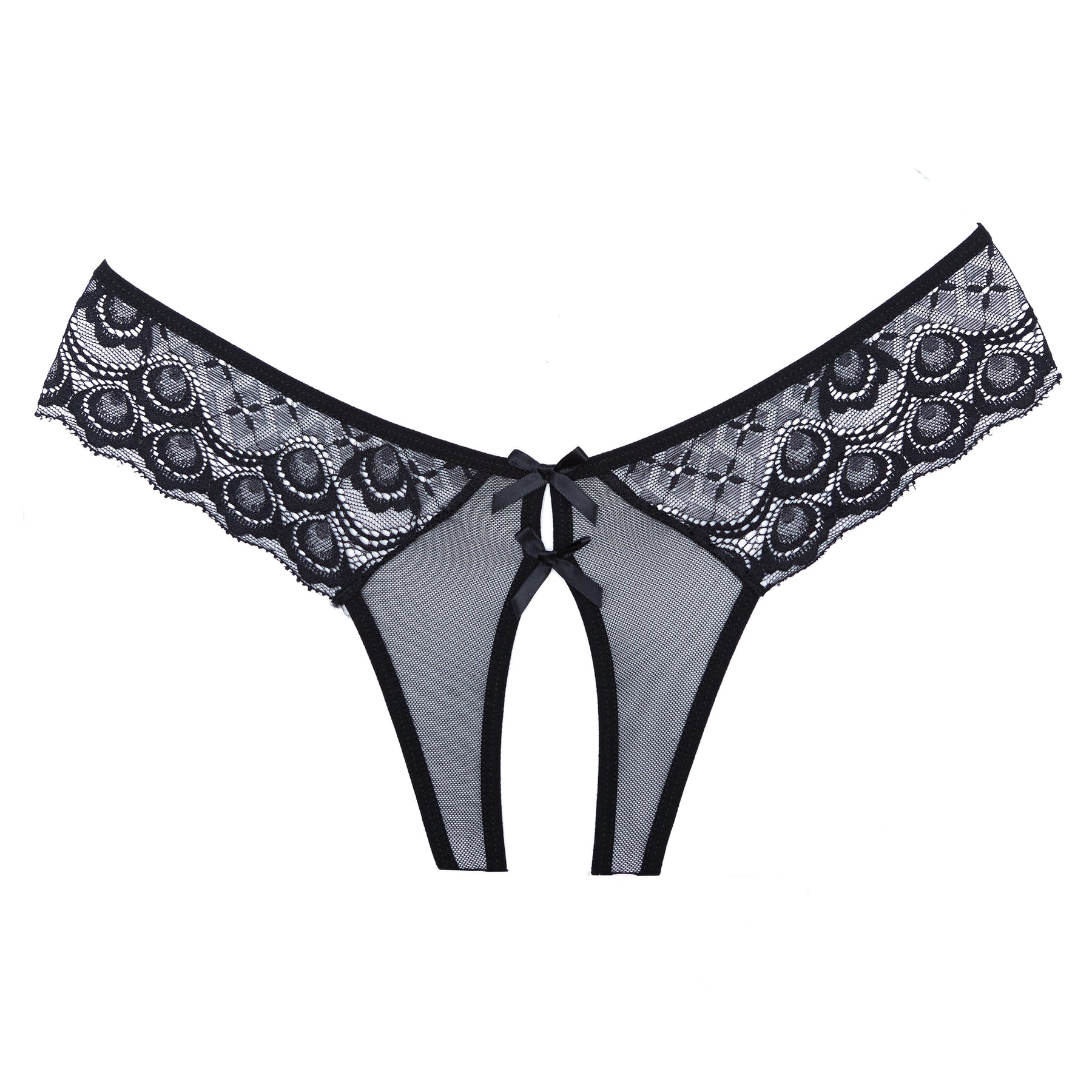 Foray into pleasure without a thought. Open Panty with thick lace bands hugging the sides, dual bow trim with skinny back straps. Crotchless.
