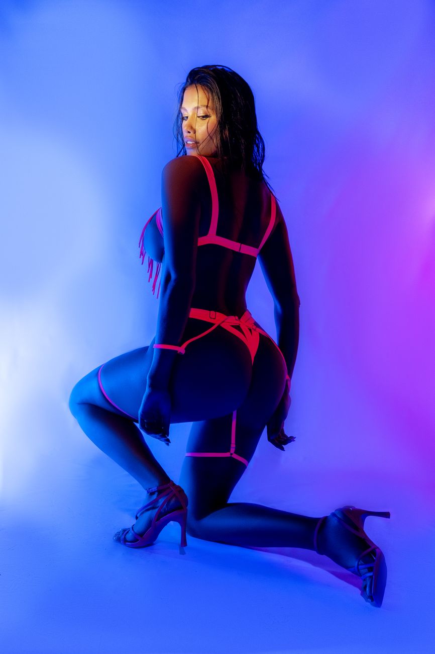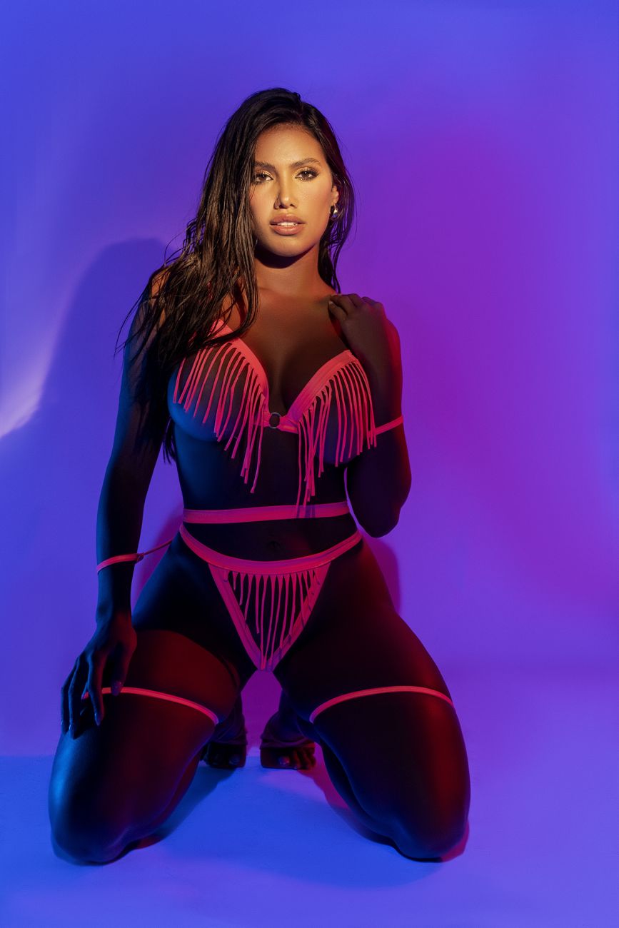 Turn up the heat with this playful two-piece set in a vibrant wet-look pink. It features top with an open-cup design with fringe details, a matching fringe bottom with attachable garter straps and wrist cuffs.