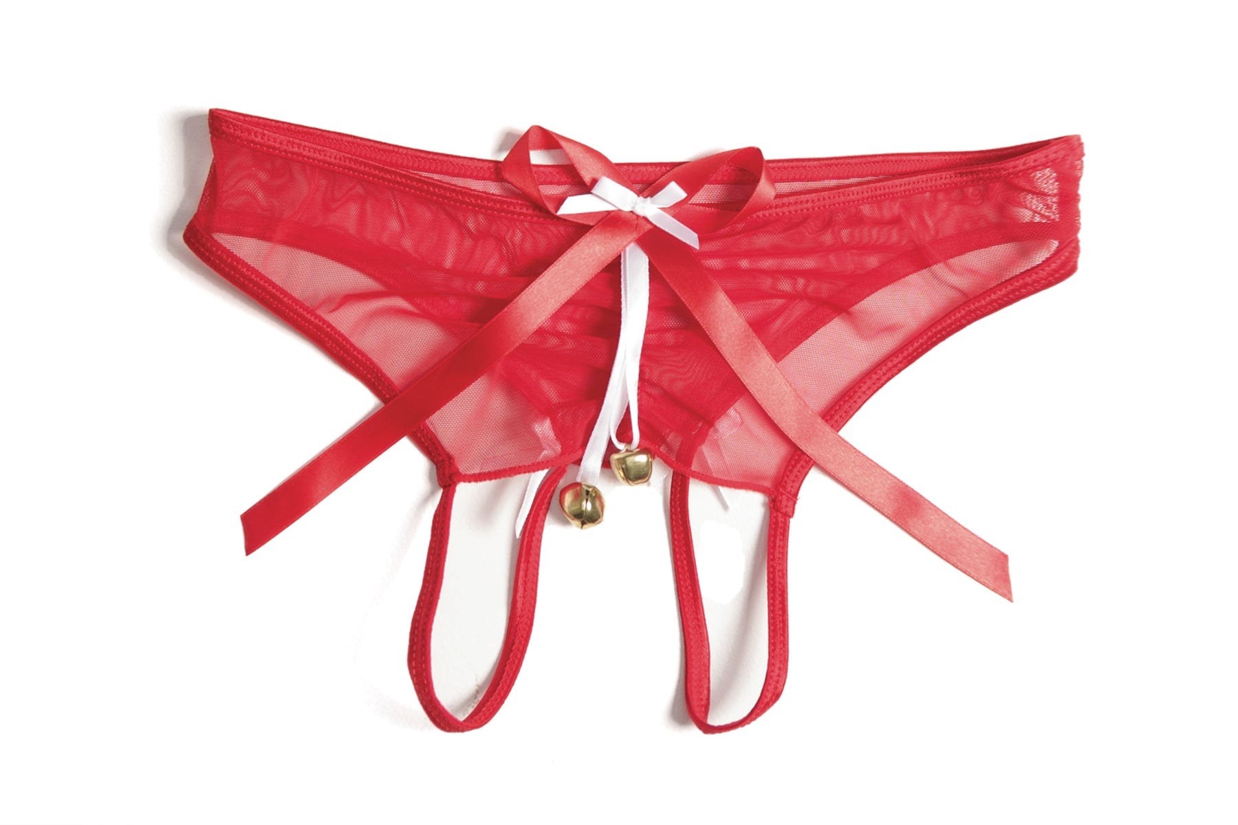 1 PC. Mesh gathered back panty with satin ribbon detail and Santa bells.
