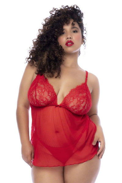The perfect mix of simplicity and romanticism. Babydoll in eyelash lace and stretch mesh contrasts, adjustable straps and matching thong. Loose silhouette.